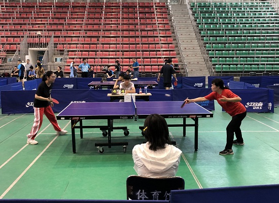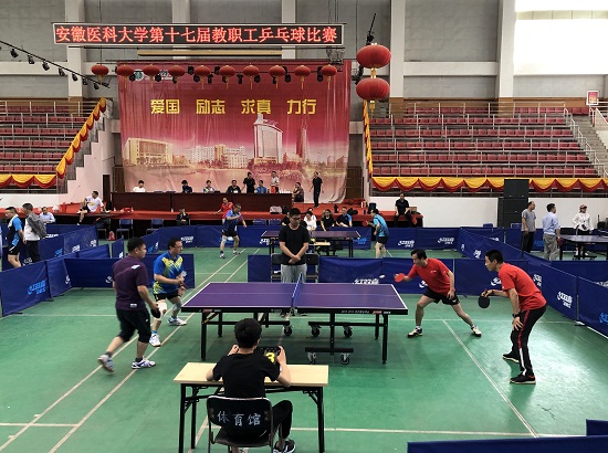 在校体育馆举办的第十七届教职工乒乓球比赛。