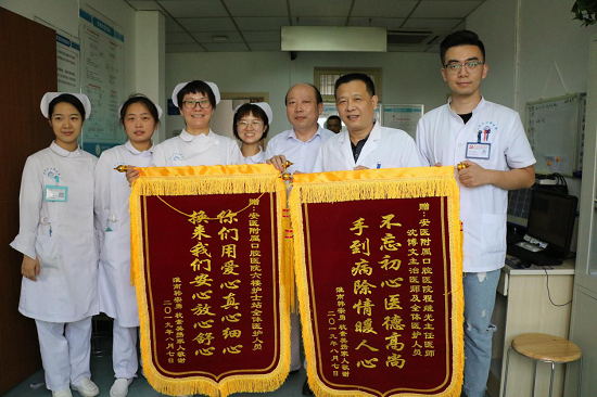 8月9日下午,口腔颌面外科患者杭女士及家属将两面锦旗送到程继光、沈博文两位医生及护理人员手中,以表达自己的谢意。
