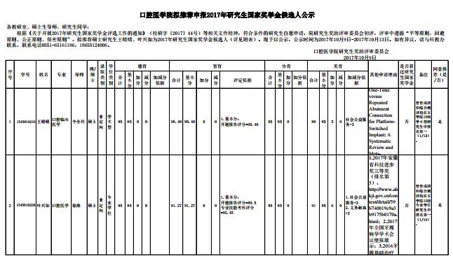 拟推荐2017年研究生国家奖学金公示